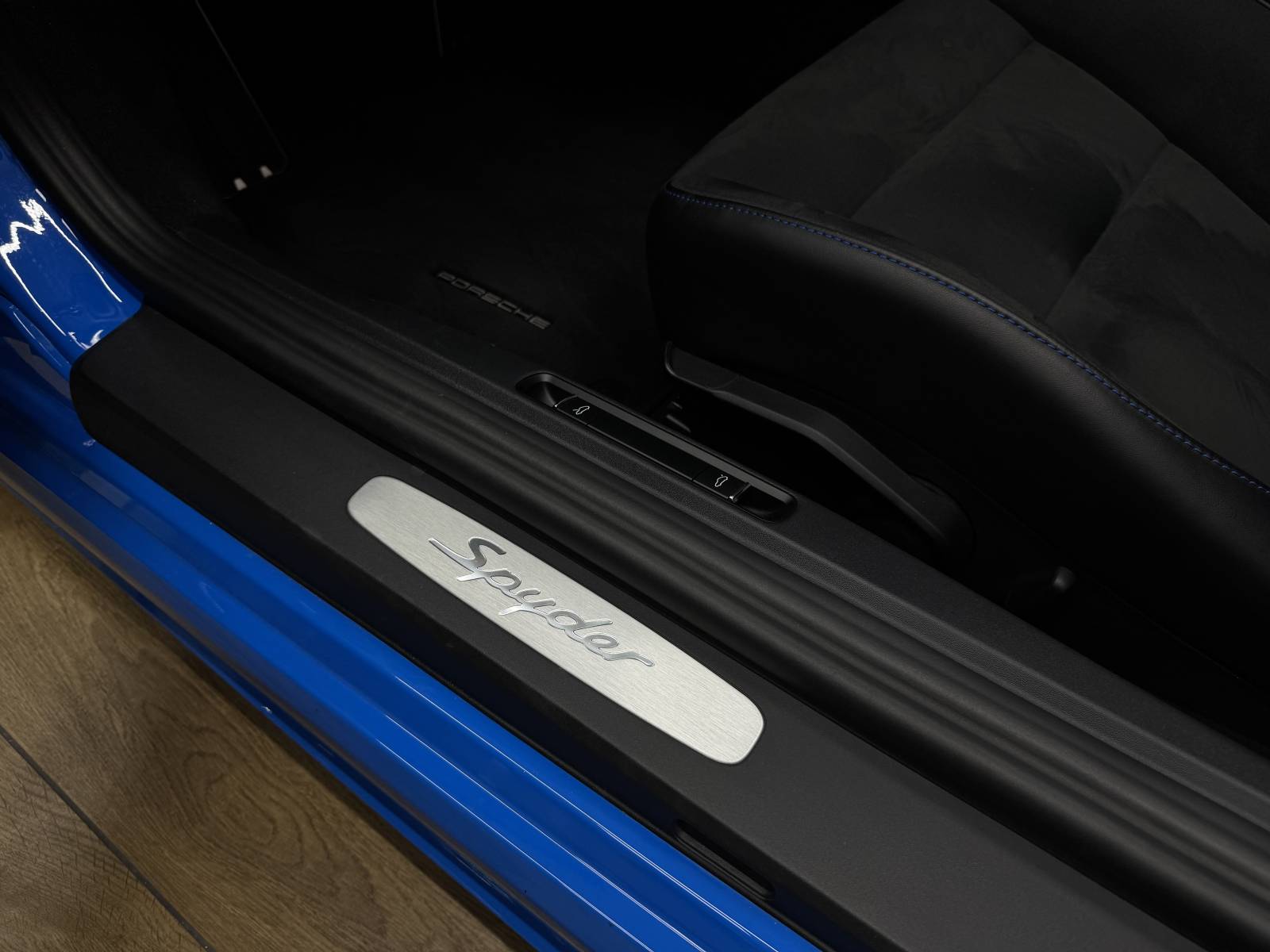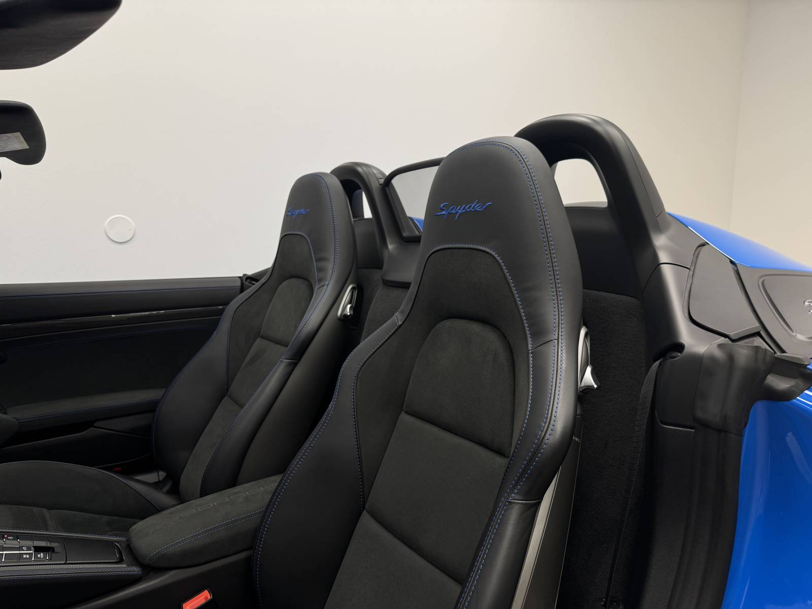 Découvrez cette Porsche 718 Spyder, présentée dans une superbe teinte Bleu Requin, disponible immédiatement.